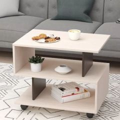 Журнальный стол "Гефест №2" имеет открытые ниши для расположения предметов домашнего быта. Удобные колесные опоры позволяют легко перемещать столик.