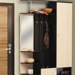 Прихожая «Кармен-7Н» имеет всё необходимое, чтобы заменить полноценную прихожую. Слева – элегантное зеркало и открытая секция с закруглёнными угловыми полками. Справа располагается вместительный отдел с глухой дверцей, под которым предусмотрена открытая ниша с полкой, где можно хранить обувь или сумки. Центральную часть занимают открытая вешалка с тремя металлическими крючками и небольшая тумба с распашной створкой. Вверху предусмотрена зона для головных уборов, опирающаяся на короткую хромированную трубу.