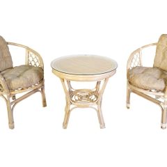 Комплект из натурального ротанга, состоящий из двух кресел и круглого столика с плетеной столешницей. Стекло входит в комплект.